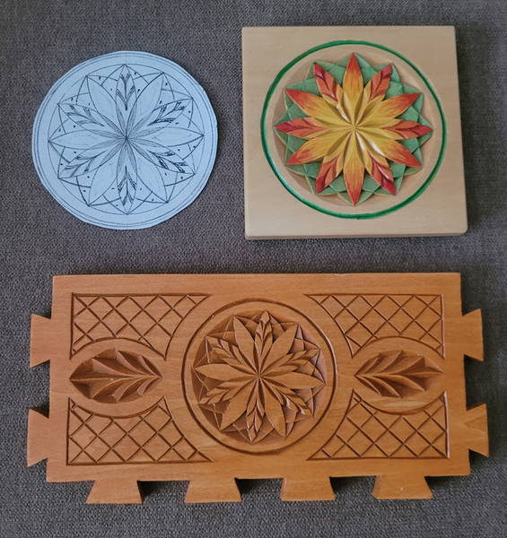The picture above has examples of this year’s ornament finished in three different ways: colored pencil, natural, and stained. It’s a great opportunity to try something new or stick to your favorite approach. Personally, I found using colored pencils to be an enjoyable way to bring extra life to the carving, but the natural and stained finishes each have their own charm too. You can see all three finishes side