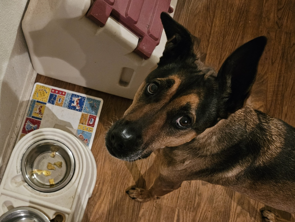 Mia is patiently waiting for the 'Go' signal to eat some leftovers.