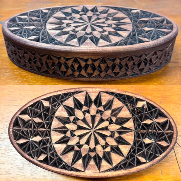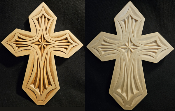 The Old World Style cuts along the outside edge, highlight an inner cross pattern made up of Swiss-style chip carving cuts. On the left, I've added some gel stain over 3 coats of clear acrylic, while the right is unfinished basswood. Either way, I think it's a beautiful pattern that's fun to carve!Â